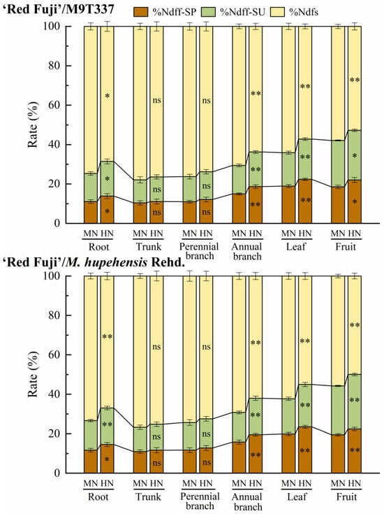Contribution of spring N application (%Ndff-SP), summer N application (%Ndff-SU), and soil N (%Ndfs) to apple organ N. SP and SU represent N application in spring and summer, respectively. Error bar indicates the standard deviation of the three replications. * represents p < 0.05, ** represents p < 0.01, ns represents not significant.