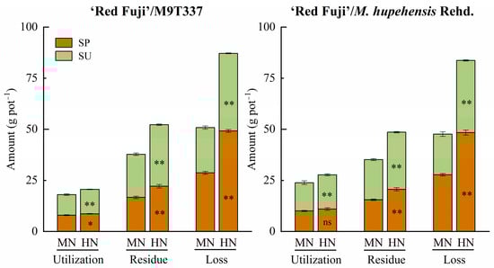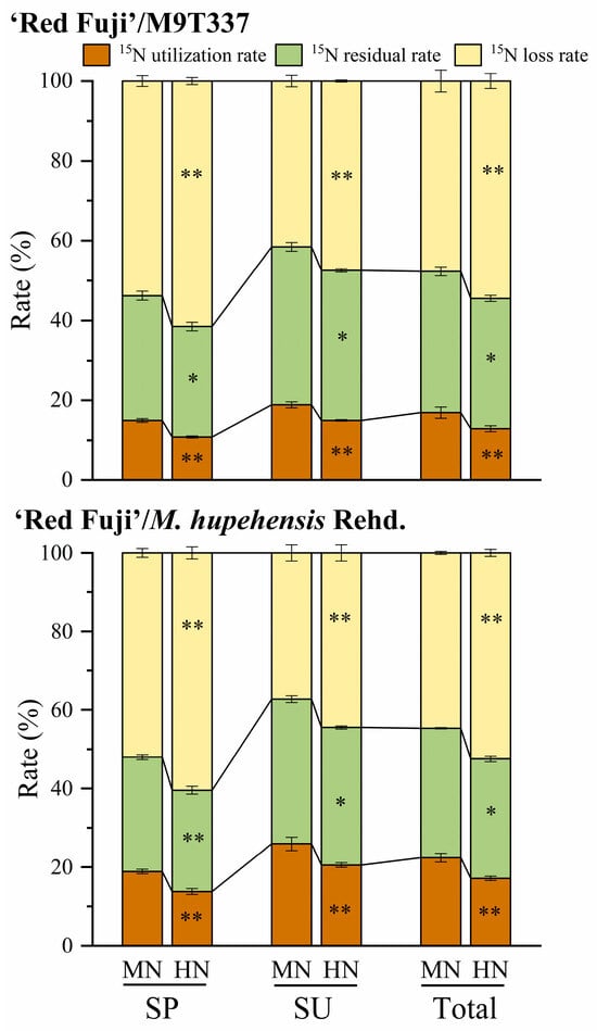 Figure 7 and Table S5 show the fate of fertilizer N from spring and summer N applications at different N levels. The study of ‘Red Fuji’/M9T337 showed that the 15N utilization rate of spring N application was lower than that of summer N application under MN and HN treatments. The total 15N utilization rate of the HN treatment was significantly lower than that of the MN treatment (decreased by 31.26%, p < 0.01), and the 15N utilization rate of spring N application and summer N application significantly decreased by 38.20 and 26.25%, respectively. Under the MN and HN treatments, the 15N residual rate of spring N application was lower than that of summer N application, and the 15N residual rate of the HN treatment was significantly lower than that of the MN (p < 0.05). The residual rates of spring and summer N application decreased by 12.91 and 5.17%, respectively. Under MN and HN treatments, the 15N loss rate of the spring N application was higher than that of the summer N application, and the 15N loss rate of the HN treatment was significantly higher than that of the MN treatment (increased by 14.24%, p < 0.01). The 15N loss rates of spring N application and summer N application increased by 14.33 and 14.13%, respectively. ‘Red Fuji’/M. hupehensis Rehd. also showed the same trend, and the 15N utilization rate (SP and SU) under different N levels was higher than that of ‘Red Fuji’/M9T337, while the residual rate and loss rate were lower than that of ‘Red Fuji’/M9T337. The 15N utilization rate and soil residual rate were higher and the loss rate was lower in summer, and the HN treatment significantly decreased the fertilizer 15N utilization rate and residual rate and increased the 15N loss rate.