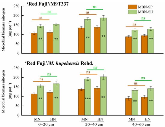 MBN-SP and MBN-SU contents in the 0–60 cm soil layer under different treatments. SP and SU represent N application in spring and summer, respectively. Error bar indicates the standard deviation of three replications. ** represents p < 0.01, *** represents p < 0.001, ns represents not significant.