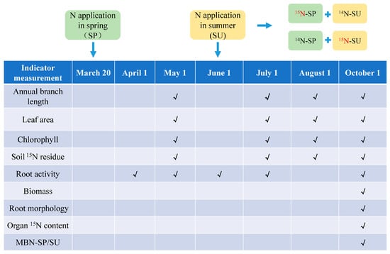 Twenty-four trees from two rootstocks were treated with each N level in each N application period. Among these, three trees of each rootstock were sampled and analyzed before treatment, and the N content of the plant was used as the basic value to calculate the N uptake of the trees. Annual branch length, leaf area, chlorophyll content, and soil 15N residues were measured in May, July, August, and October, respectively, and root activity was measured in April, May, June, July, and October (Figure 10).