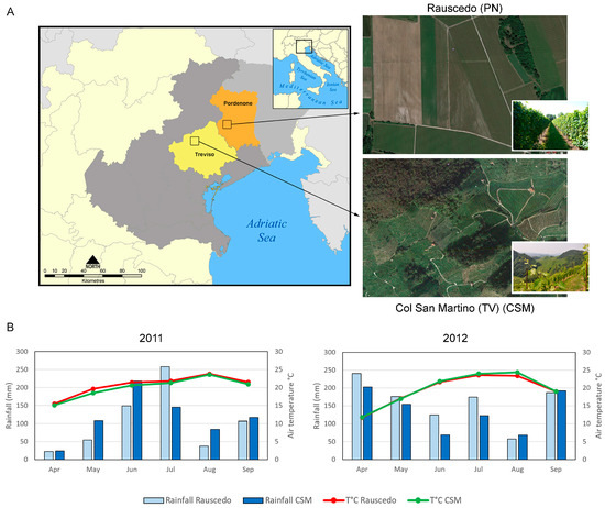 The meteorological data were provided by the Veneto region meteorological services (ARPAV) for the CSM site and by the Friuli Venezia Giulia regional meteorological observatory (ARPA FVG, Pordenone, Italy) for the Rauscedo site.