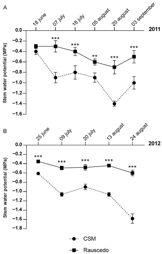 Due to the different timing of observation and the different number of sampling points in the two years, the stem water potential data were analyzed with a one-way ANOVA for each individual vintage.