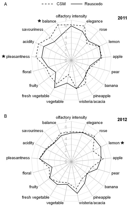 Vintage 2012 showed more pronounced differences in the aroma profiles, in particular the lemon olfactory note that was mentioned for Rauscedo grapes. This could be partially explained by the citrusy lemon note of β-citronellol, whose concentration in the berries was more than double in Rauscedo compared to CSM (14 µg/kg versus 6 µg/kg), although the total terpene content was lower in the grapes grown at Rauscedo than at the CSM hillside site.