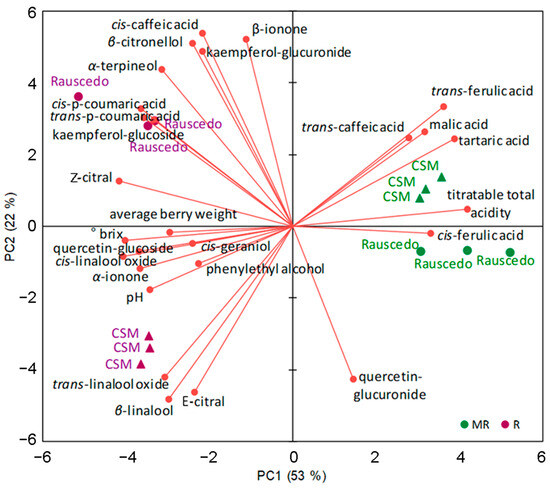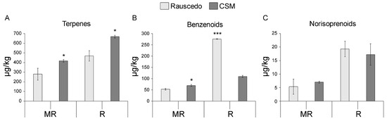 38]. Consistently, we here recorded a significantly higher content of benzenoids in Rauscedo vineyard in comparison to that found in CSM at the ripening stage.