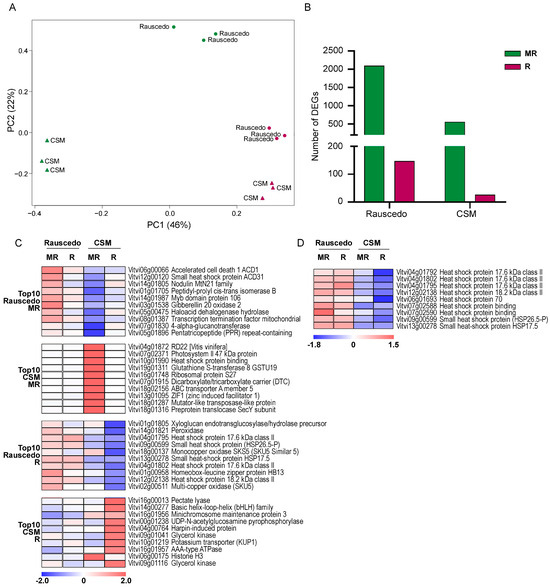 36]) and a heat shock protein (Vitvi10g01990) encoding genes that might be induced in response to the slightly higher temperature registered at CSM compared to Rauscedo at the MR stage.