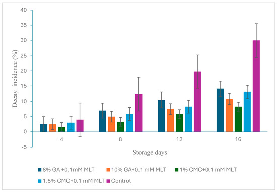 Impact of combined treatments of hydrocolloids and melatonin on decay incidence (%) in ‘Snow Queen’ nectarine fruits during storage at supermarket conditions (18 ± 1 °C and 85–90% R.H.). Data are expressed as mean ± standard errors of triplicate sample at p < 0.05.
