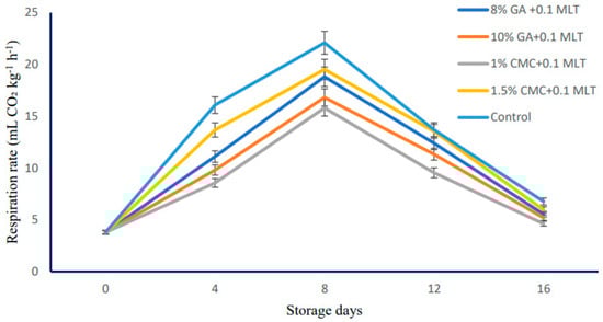 Respiration rate of ‘Snow Queen’ nectarine as influenced by combined treatments of hydrocolloids and melatonin (mL CO2 kg−1h−1) during storage at supermarket conditions (18 ± 1 °C and 85–90% R.H.). Data are expressed as mean ± standard errors of triplicate sample at p < 0.05.