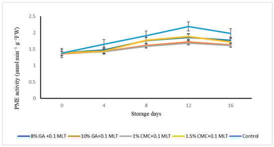 Effect of combined treatments of hydrocolloids and melatonin on pectin methylesterase (PME) activity (µmol min−1 g−1 FW) of ‘Snow Queen’ nectarine, stored at supermarket conditions (18 ± 1° C and 85–90% R.H.). Data are expressed as mean ± standard errors of triplicate sample at p < 0.05.