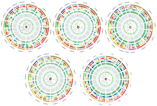 Circos plots showing genomic features in (a) A. hypochondracus, (b) A. tuberculatus, (c) A. palmeri, (d) A. hybridus, and (e) A. cruentus. The genomic feature in the concentric circles indicates the sixteen scaffolds in (Figure 1A–D), and seventeen chromosomes in (Figure 1E). The tracks from outer to inner circles indicate A: the density of genic SNPs in 1-Mb windows; B: density of intergenic SNPs in 1-Mb windows; C: density of TFs in 1-Mb windows; D: distribution of protein-coding genes; E: distribution of (mono- to hexa-) type of SSRs; F: transporter genes; G: putative miRNAs.