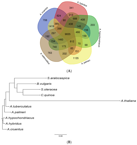 The groups of orthologs shared by the Amaranthaceae species. (A) Groups of orthologs shared between A. hypochondriacus, A. tuberculatus, A. palmeri, A. hybridus, and A. cruentus. Venn diagram was generated from Bioinformatics & Evolutionary Genomics portal. (B) Phylogeny of the concatenated dataset using 406 single-copy orthologs extracted from five amaranth species, and five other genomes. The A. thaliana was taken as an out-group in this analysis.