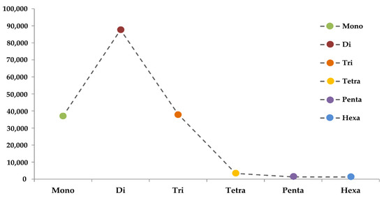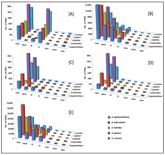 From the total SSRs predicted among five amaranth species, di-nucleotides were the most abundant, followed by tri-nucleotides, mono-nucleotides, tetra-nucleotides, penta-nucleotides, and hexa-nucleotide repeats, except in A. hybridus, A. palmeri, and A. cruentus, which had greater numbers of hexa-nucleotides compared to penta-nucleotide repeats (Figure 4; Table S4).