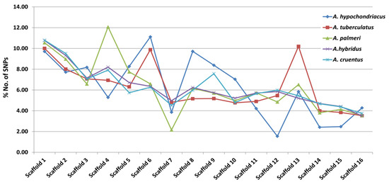 DNA-based markers such as SNP markers have gained popularity due to their abundance and their role in marker-assisted selection. The BioProject numbers PRJNA290898, PRJNA432348, and PRJNA626536 have been used for SNP mining. A total of 958,646, 1,570,771, 760,209, 997,675, and 1,322,409 SNPs were identified in A. hypochondriacus, A. tuberculatus, A. palmeri, A. hybridus, and A. cruentus, respectively. SNPs were distributed asymmetrically across all sixteen scaffolds. The highest number of SNPs in A. hypochondriacus is found in scaffold 6, 106,528 (11.11%), followed by scaffold 8 (9.71%), scaffold 1 (9.70%), scaffold 9 (8.37%), scaffold 5 (8.26%), scaffold 3 (8.17%), and scaffold 12 (1.54%) in that order (Figure 6). On the other hand, scaffold 13 in A. tuberculatus contains the highest number of SNPs, 160,174 (10.19%), followed by scaffold 1 (10%), scaffold 6 (9.88%), scaffold 2 (8.01%), scaffold 3 (7.06%), scaffold 4 (6.93%), and scaffold 16 (3.52%) in that order (Figure 6). In A. palmeri, scaffold 4 has the highest number of SNPs, 91,732 (12.06%), followed by scaffold 1 (10.54%), scaffold 2 (8.97%), scaffold 5 (7.73%), scaffold 6 (6.58%), scaffold 3 (6.57%), and scaffold 7, which contains the least number of SNPs, 16,358 (approximately 2.15%) of the total SNPs (Figure 6). While in A. hybridus, scaffold 1 contains the highest number of SNPs, 106,720 (10.76%), followed by scaffold 2 (9.31%), scaffold 4 (8.2%), scaffold 3 (7.14%), and scaffold 5 (6.71%). Similarly, in A. cruentus, scaffold 1 contains the highest number of SNPs, 142,684 (10.79%), followed by scaffold 2 (9.51%), scaffold 4 (7.9%), scaffold 9 (7.5%), and scaffold 3 (7.0%) (Figure 6).