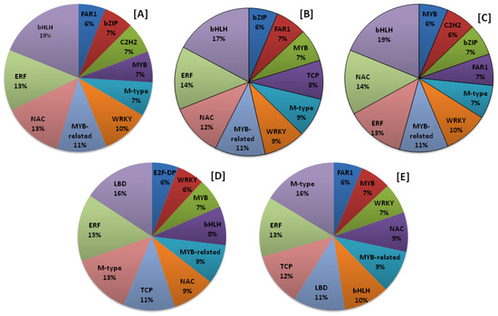 Distribution of top ten TF categories across five amaranth plant species. (A) A. hypochondriacus, (B) A. tuberculatus, (C) A. palmeri, (D) A. hybridus, and (E) A. cruentus.