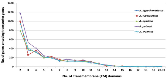 In the transporter gene analysis, out of all the predicted transmembrane proteins in A. palmeri (6984), followed by A. tuberculatus (6443), A. cruentus (5789), A. hybridus (5106), and A. hypochondriacus (5789), non-redundant transporter genes carrying two or more transmembrane domains, which are (2760) A. hypochondriacus, (2905) A. tuberculatus, (2642) A. hybridus, (3402) A. palmeri, and (2760) A. cruentus, were selected for further analysis. In the five amaranth species, the maximum number of transporter genes contained two TM domains, gradually decreasing as the number of TM domains increased (Figure 8).