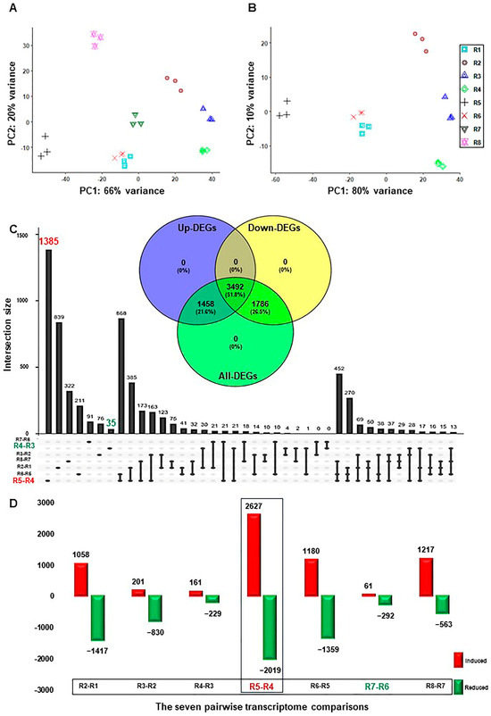 Temporal dynamics of RUG rootstock transcriptome during salt and recovery treatments. (A) Principal Component Analysis (PCA) showing the global similarity among RNA-seq samples of RUG rootstock, where salt stress was applied gradually, followed by a recovery procedure. (B) The PCA of the transcriptome data after excluding the recovery samples. (C) The Upset plot of the total number of the differentially expressed genes (DEGs) of each comparison. By using the DESeq2 pipeline, each two consecutive time points during the salinity and recovery procedure were compared, resulting in 13,214 (6736 non-redundant), with |log2FC| > ±1.5 and p-adjusted < 0.05. The included Venn diagram showed the non-redundant DEGs among the total, up-, and down-regulated transcripts. (D) Bar plots of DEGs that demonstrated the temporal expression patterns of genes in RUG during salinity and recovery procedures. The sampling order R1–R8 refers to the sampling time as follows: control, 0 h, 0.5 h, 2 h, 24 h, 48 h, 4 days, and 12 days, respectively. Each time point during the salinity and recovery treatments was given a distinctive color and symbol.