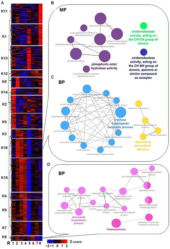 Heatmap of the K-means clusters of the 12,760 non-redundant significantly expressed genes throughout salinity stress in RUG. (A) By using transcript per million (TPM) of the 12,760 non-redundant significantly expressed genes during salinity stress, the K-means algorithm generated 15 clusters (K1 to K15) that were hierarchically clustered utilizing Pearson pairwise correlation. The sampling order R1–R8 refers to the sampling time, as described in Figure 1. (B–D) Network views for specific predefined Biological processes GO terms pathways for significantly expressed genes within K8 and K10, and the Molecular Function (MF) in K10 only. All MF and BP GO terms for each cluster (p-adjusted < 0.05) were extracted by the g:Profiler website with the Benjamini-Hochberg FDR multiple testing correction method. The default ClueGO settings were applied, and the terms are functionally grouped based on shared genes (kappa score), shown with different colors. The size of the nodes indicates the number of mapped genes ranged from 0–5, 5–10, 10–20, 20–30, and ≥30 genes. The most significant term defines the name of the group.
