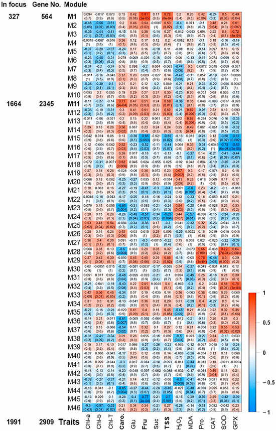 The pairwise correlations among the 18 samples (control, 0 h, 0.5 h, 2 h, 24 h, and 48 h) identified 46 modules, which were labeled in distinct colors shown in a hierarchical clustering dendrogram and network heatmap (Figures S8 and S9). The analysis of module-trait correlations among the identified modules and the physiological data enabled us to identify 6 and 2 modules with positive and negative correlations, respectively (Figure 3). Among the positively correlated modules, the M1 module was highly correlated with Fru and TSS modules (r2 ≥ 0.81 and 0.72, respectively), holding 327 significant genes. The M3 and M32 (10 and 18 significant genes, respectively) displayed a substantial positive correlation with GPX (r2 ≥ 0.72). Finally, the M11, M28, and M29 modules involving 1664, 17, and 29 significant genes were positively correlated with Caro, SOD, and Pro (r2 ≥ 0.71), respectively. On the other hand, M16 module showed a negative correlation with SOD and GPX (r2 ≥ −0.73), while M45 was negatively associated with Fru (r2 ≥ −0.77).