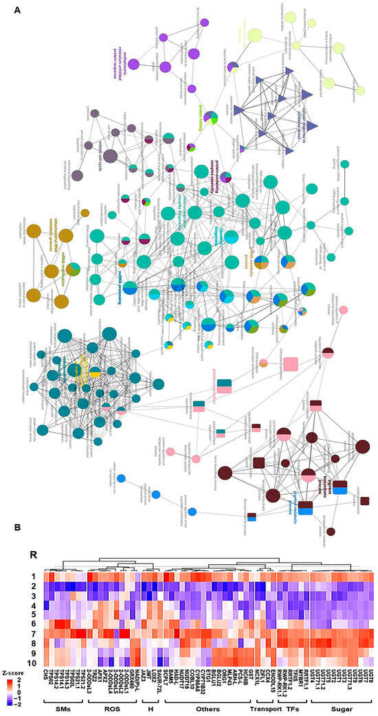 Consequently, we focused on the most two prominent modules (M1 and M11), exhibiting positive correlation and holding 2065 significant genes (Figure 3). The GO terms and KEGG enrichment analysis of M1 and M11 modules exposed high enrichment of GO terms associated with stress adaptation (Table S5). For instance, M1 displayed considerable enrichment of BP GO terms for “cellular response to hormone stimulus”, “hormone-mediated signaling pathway”, “ethylene-activated signaling pathway”, “regulation of biosynthetic process”, “regulation of cellular metabolic process”, “regulation of primary metabolic process”, glycosyltransferase activity, and “cell wall polysaccharide metabolic process” (Figure S10 and Table S5). However, M11 was highly enriched for BP GO terms for “plastid organization”, “chloroplast organization”, “pigment metabolic process”, “pigment biosynthetic process”, “cellular response to oxidative stress”, “chlorophyll metabolic process”, “superoxide metabolic process”, “chlorophyll biosynthetic process”, “protein import into chloroplast stroma”, “thylakoid membrane organization”, “plastid membrane organization”, “response to superoxide”, “removal of superoxide radicals”, “cellular response to superoxide”, “cellular response to oxygen radical”, “response to oxygen radical”, “regulation of chlorophyll metabolic process”, “flavonoid metabolic process”, “regulation of cellular biosynthetic process”, “carbohydrate metabolic process”, “response to reactive oxygen species”, “regulation of biosynthetic process”, and “carotenoid metabolic process” (Figure 4A and Figure S11 and Table S5). Altogether, the WGCNA approach and the GO term enrichments analysis of positively correlated modules (M1 and M11) confirmed the high correlation of photosynthesis, carbohydrates, and ROS homeostasis with salinity adaptation of RUG rootstock.