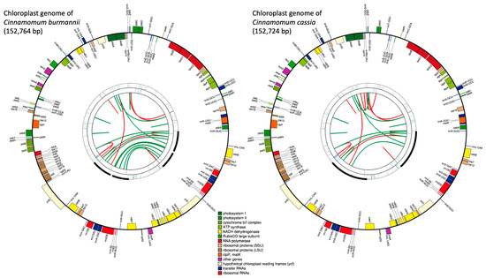 Chloroplast genome maps of C. burmannii and C. cassia generated via CPGAVAS2. Each map contains four rings. From the center going outward, the first circle shows the forward and reverse repeats connected with red and green arcs, respectively. The second circle shows the tandem repeats marked with short bars. The third circle shows the microsatellite sequences identified using MISA. The fourth circle shows the gene structure on the plastome. The genes are colored based on their functional categories, which are shown at the bottom.