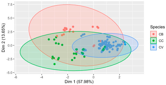 Classification of species based on the metabolite (16) contents in the sample, with 71.63% variance covered. Species: CB—C. burmannii, CC—C. cassia, and CV–C. verum.