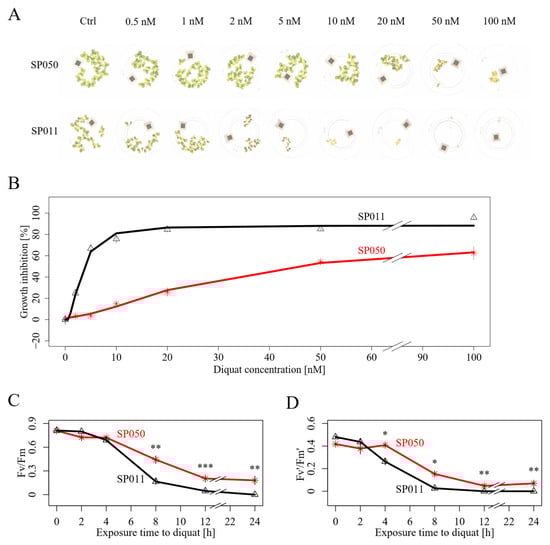 (A) Foyer–Asada–Halliwell cycle according to Noctor and Foyer, 1998 [36]. Enzymes are highlighted by red margins. Metabolites analyzed in this study are underlined. SOD converts superoxide anions to H2O2. Through oxidation of AsA, H2O2 is degraded to H2O by APX. AsA is regenerated by oxidation of GSH to GSSG. The latter is reconverted to GSH by GR, consuming NADPH. SOD—superoxide dismutase, APX—ascorbate peroxidase, MDHAR—monodehydroascorbate reductase, DHAR—dehydroascorbate reductase, GR—glutathione reductase. The time course of mean GSH/GSSG (B) and AsA/DHA (C) ratios of four to five replicates with their respective standard errors are shown for SP050 and SP011. SP050 exhibited a significantly increased GSH/GSSG ratio over SP011 after 4 h of diquat treatment and an increased AsA/DHA ratio after 4, 8, and 24 h of diquat treatment (unpaired two-sided Student’s t-test). (D) Mean SOD activity after 1-day incubation at 10 nM of diquat or control conditions for three biological replicates ± standard error. Genotype SP050 exhibited a significantly higher SOD activity than SP011 after 24 h of diquat exposure. *—0.05 ≥ p-adjust > 0.01, **—0.01 ≥ p-adjust > 0.001, ***—p-adjust < 0.001 (two-sided Student’s t-test).