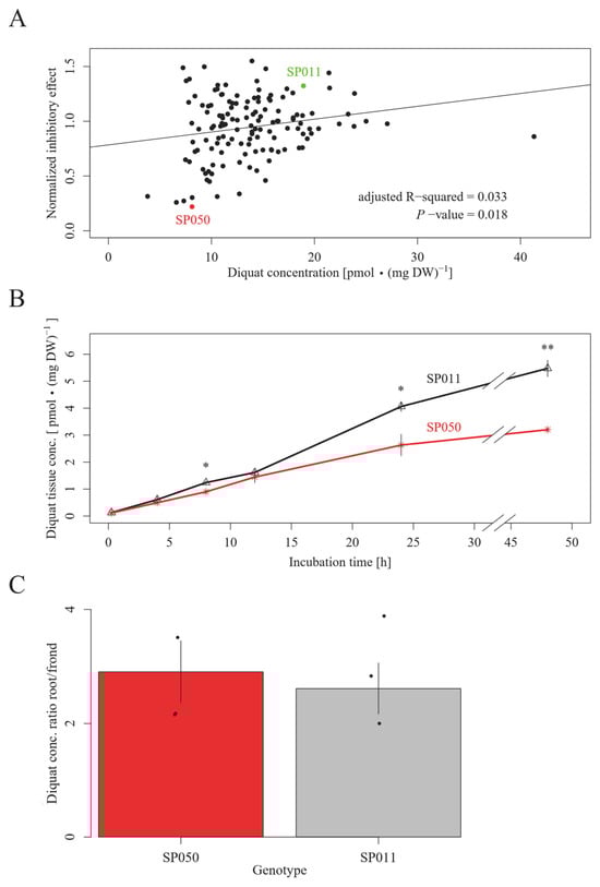 Uptake and translocation mechanisms of diquat. (A) The diquat resistance calculated based on the inhibition of the RGR of the frond number is significantly correlated (F-test) with the diquat tissue concentration of 137 genotypes. (B) After 24 and 48 h of diquat exposure, SP011 accumulated significantly more diquat than SP050. *—0.05 ≥ p-adjust > 0.01, **—0.01 ≥ p-adjust > 0.001 (two-sided Student’s t-test). (C) Both genotypes showed an approximately three-fold higher concentration of diquat in root tissue compared to frond tissue. No significant difference between the two genotypes was found (two-sided Student’s t-test). The diquat tissue concentration was measured after 24 h of diquat exposure.