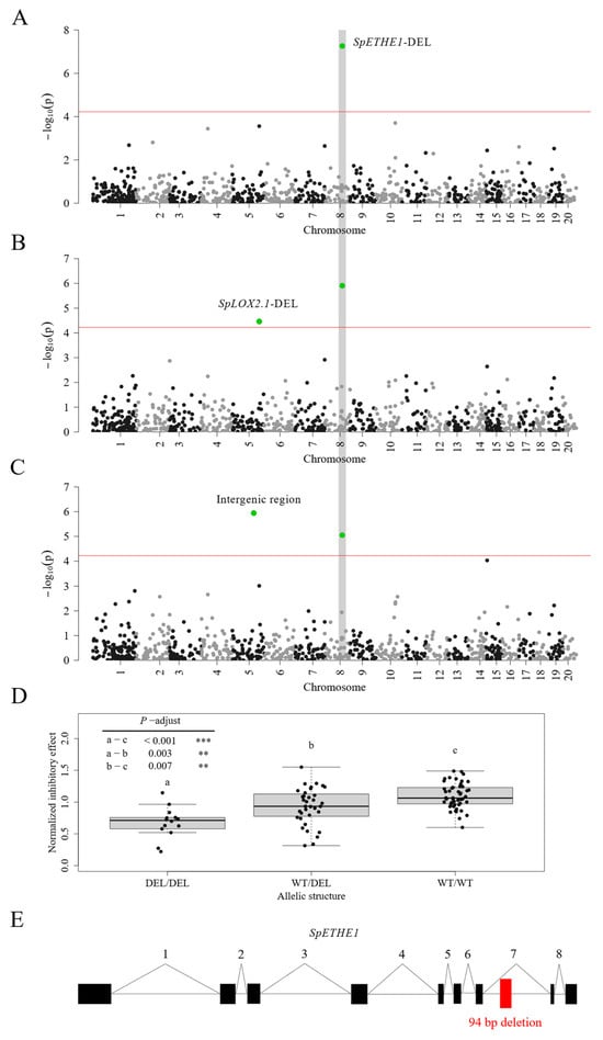 (A–C) Manhattan plots from a GWAS conducted on structure variations, highlighting the diquat resistance-associated 94 bp deletion in SpETHE1. All significant markers (Wald test) were highlighted as green dots. The Bonferroni corrected significance threshold (red line) at p < 0.05 is 5.94 × 10−5. The GWAS was conducted using normalized inhibition effects calculated based on frond number (A), frond area (B), and fresh weight (C). (D) Box plot of mean values of the norm. IE RGR of the frond number of genotypes carrying the respective alleles. On average, genotypes homozygous for the deletion were more resistant to diquat than heterozygous genotypes or genotypes without the deletion. **—0.01 ≥ p-adjust > 0.001, ***—p-adjust < 0.001 (Tukeys HSD). Heterozygous genotypes exhibited a greater mean resistance than genotypes without deletion. (E) Gene structure of SpETHE1 with the 94 bp deletion in the seventh intron highlighted as a red box.