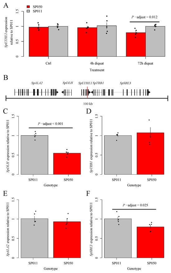 To further validate the association between the 94 bp deletion in the SpETHE1 intron and diquat resistance, we amplified the deletion region using PCR in the genomes SP050 and SP011. These two genotypes showed different levels of diquat resistance. The results confirmed that SP050 is homozygous for the identified deletion and that SP011 is lacking the deletion completely (Figure A13A). We then aimed to examine whether the deletion affected the expression or splicing of SpETHE1 using qPCR. To this end, we conducted a time-course experiment and analyzed the expression and splicing of SpETHE1 in the roots and fronds, respectively. We could not find any differences in the splicing pattern between SP050 and SP011, neither for the control nor for the diquat-treated samples (Figure A13B). We found that SpETHE1 expression was elevated in the root tissue relative to the frond tissue, approximately by a factor of three in both genotypes (Figure A14B). However, under control conditions and within 4 h of diquat treatment, the expression levels were similar between SP011 and SP050 (Figure 5 and Figure A14). After 72 h of diquat treatment, in the fronds, SpETHE1 expression was 21% lower in SP050 compared to SP011, and it showed similar expression in the roots (Figure 5A and Figure A14A). The differential expression is likely due to the differences in diquat uptake between the two genotypes.