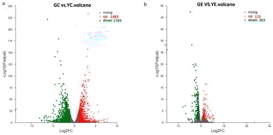 Volcano plot map of differentially expressed genes (DEGs) in the leaf color mutant yl20 and the WT. (a) The DEGs number in the cotyledon stage. (b) The DEGs number in the euphylla stage. YC, yellow leaves of yl20 in the cotyledon stage. YE, yellow young leaves of yl20 in the euphylla stage. GC, normal green leaves of WT in cotyledon stage. GE, normal green leaves of WT in the euphylla stage.