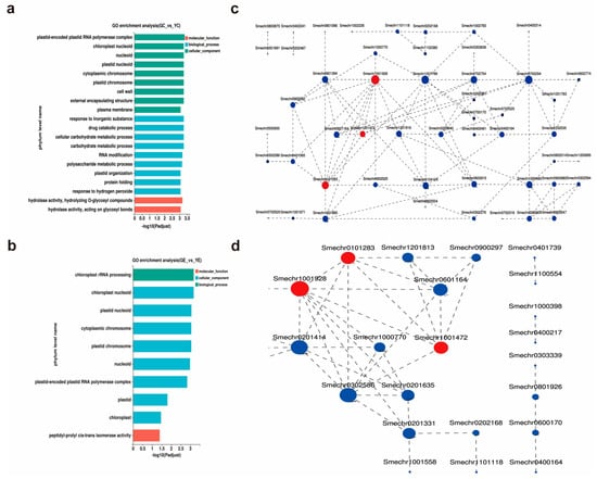 Since cytological observations revealed marked chloroplast damage in the mutant, we focused on the chloroplast-related GO terms. Among the 79 terms enriched in the cotyledon stage, four terms, comprising 74 genes, were related to chloroplast: “chloroplast nucleoid”, “chloroplast organization”, “chloroplast stroma”, and “chloroplast rRNA processing”. Of these 10 terms enriched in the euphylla stage, three terms, comprising 43 genes, were related to chloroplast: “chloroplast rRNA processing”, “chloroplast nucleoid”, and “chloroplast”. To further explore the gene interaction and identify the chloroplast-related core genes, expression interaction (protein–protein interaction (PPI)) networks of the 74 and 43 DEGs associated with chloroplast development were constructed. The PPI networks showed Smechr1001928 (Fln2), Smechr0101283 (CITRX), and Smechr1001472 (SODF2) as common DEGs between the cotyledon and euphylla stages. Moreover, these three DEGs were significantly downregulated in the mutant than WT in both growth stages (Supplementary Table S5). Of these three DEGs, the circle associated with Smechr1001928 was the largest in both growth stages, indicating that it might play a key role in yellow leaf formation (Figure 4c,d).