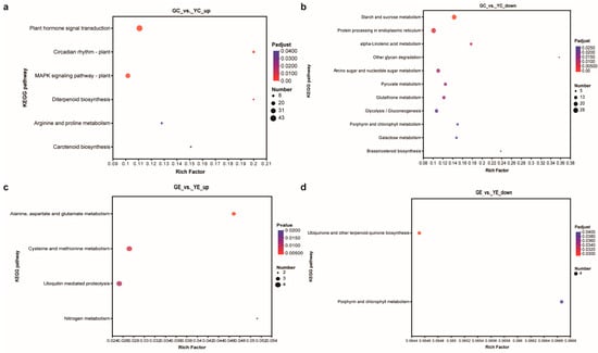 The KEGG pathways enrichment analysis of DEGs in the leaf color mutant yl20 and the WT. (a) Analysis of KEGG pathways enriched for the upregulated DEGs in the cotyledon stage. (b) Analysis of KEGG pathways enriched for the downregulated DEGs in the cotyledon stage. (c) Analysis of KEGG pathways enriched for the upregulated DEGs in the euphylla stage. (d) Analysis of KEGG pathways enriched for the downregulated DEGs in the euphylla stage. YC, yellow leaves of yl20 in the cotyledon stage. YE, yellow young leaves of yl20 in the euphylla stage. GC, normal green leaves of WT in cotyledon stage. GE, normal green leaves of WT in the euphylla stage.
