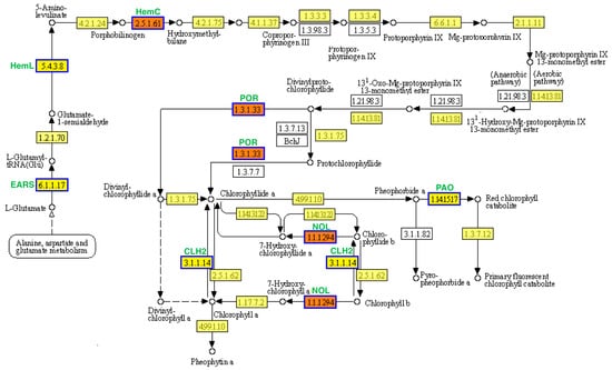KEGG analysis was used to identify the enriched biological pathways. In the cotyledon stage, the upregulated and downregulated DEGs were significantly enriched in 6 and 11 pathways, respectively (Figure 5a,b). In the euphylla stage, the upregulated and downregulated DEGs were significantly enriched in four and two pathways, respectively (Figure 5a,b). The “porphyrin and chlorophyll metabolism” pathway was common between both growth stages, indicating that this pathway might be crucially related to leaf color mutation. Furthermore, nine and four DEGs in the cotyledon and euphylla stages, respectively, were associated with this pathway. Of these, three DEGs, Smechr0400217 (POR), Smechr0702754 (HemC), and Smechr100398 (POR), were common in both growth stages (Figure 6, Table 2).