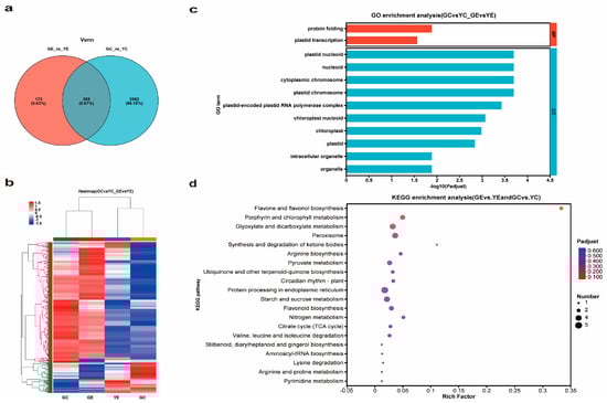Seven different biological trait parameters were detected between GE and YE. The results showed that the stem diameter, plant height, plant weight, and root weight levels of YE were significantly lower than those of GE. The leaf number and leaf area levels were significantly higher than those of GE (Table S2).
