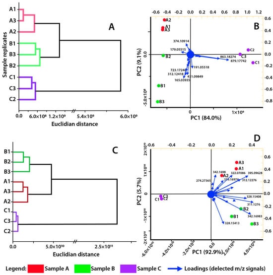 Multivariate analysis of O. delicata samples and replicates. (A) Hierarchical Clustering Analysis on negative ionization mode; (B) Principal Component Analysis on negative ionization mode; (C) Hierarchical Clustering Analysis on positive ionization mode; (D) Principal Component Analysis on positive ionization mode. Letters A, B, and C within each graphic represent each collected specimen, while the numbers following them are the replicates within each specimen. Loadings values in (B,D) are m/z signals detected within the samples.
