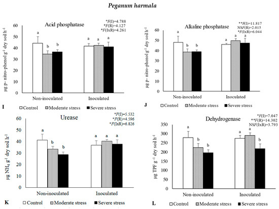 Activities of acid phosphatase (A,E,I), alkaline phosphatase (B,F,J), urease (C,G,K), and dehydrogenase (D,H,L) in the rhizosphere of different plant species: Atriplex halimus, Pennisetum setaceum, and Peganum harmala. Plants were grown under non−inoculated and inoculated conditions and under three water irrigation regimes: Control—watered at 80% of field capacity (FC); Moderate Stress—watered at 45% of FC; Severe Stress—watered at 30% of FC. Data are shown as means ± standard errors (n = 3). A two−way ANOVA was performed to determine the influence of microbial inoculation (I) and irrigation regimes (R) on enzymatic activity (acid phosphatase, alkaline phosphatase, urease, and dehydrogenase). The results are shown with the test statistic for each case (I: microbial inoculation; R: irrigation regimes; I x R: microbial inoculation x irrigation regimes) and as NS (non−significant) at the level p > 0.05; * significant at the level p < 0.05; ** p < 0.01; *** significant at the level p < 0.001, respectively. One−way ANOVA was performed to determine the influence of irrigation on enzymatic activity for each inoculation treatment at the end of the experiment. Means for the same inoculation treatment showing different letters are significantly different from each other (p < 0.05) according to Duncan’s test.