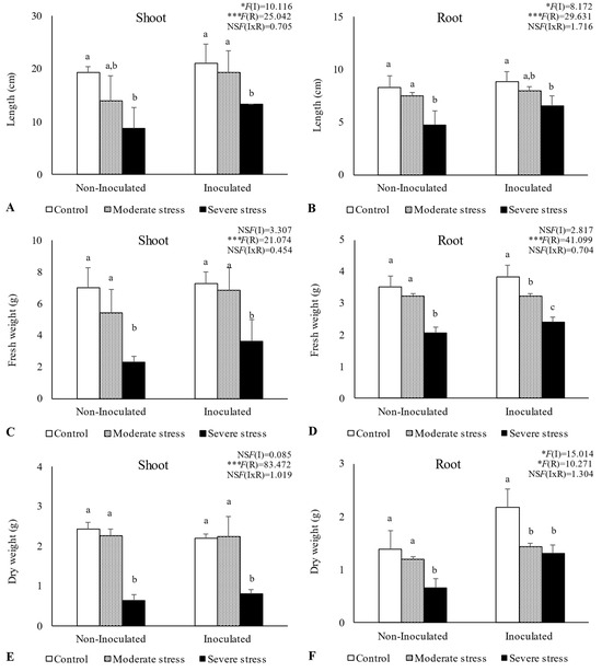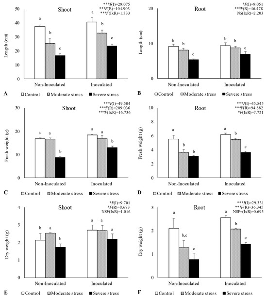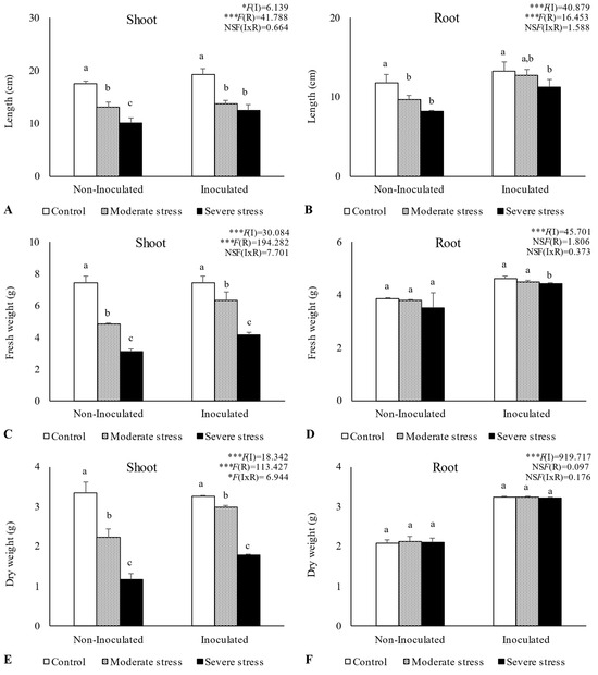 Shoot length (A), root length (B), shoot fresh biomass (C), root fresh biomass (D), shoot dry biomass (E), and root dry biomass (F) of Atriplex halimus growing under different water regimes (Control—watered at 80% of field capacity (FC); Moderate Stress—watered at 45% of FC; Severe Stress—watered at 30% of FC) and under non-inoculated and inoculated conditions. Data are shown as means ± standard errors (n = 3). A two−way ANOVA was performed to determine the influence of microbial inoculation (I) and irrigation regimes (R) on plant growth parameters (shoot length, root length, shoot fresh biomass, root fresh biomass, shoot dry biomass, and root dry biomass). The results are shown with the test statistic for each case (I: microbial inoculation; R: irrigation regimes; I x R: microbial inoculation x irrigation regimes) and as NS (non-significant) at the level p > 0.05; * significant at the level p < 0.05; *** significant at the level p < 0.001, respectively. One−way ANOVA was performed to determine the influence of irrigation regimes on plant growth parameters for each inoculation treatment at the end of the experiment. Means for the same inoculation treatment showing different letters are significantly different from each other (p < 0.05) according to Duncan’s test.