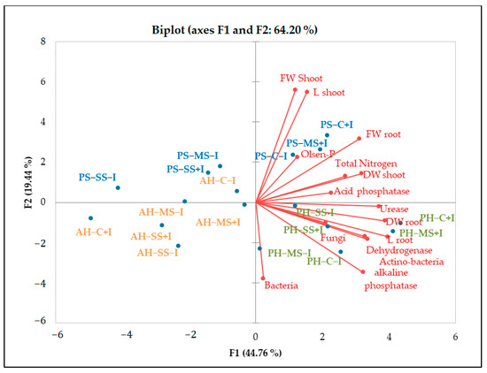 A two-way ANOVA was performed to determine the influence of microbial inoculation (I) and irrigation regimes (R) on different parameters with the SPSS program (IBM, Armonk, NY, USA, version 25.0). One-way ANOVA was carried out to determine the influence of the irrigation regimes on the different parameters for each inoculation treatment at the end of the experiment. Student’s t-test was used to compare pre-plant and post-plant soil parameters. A statistical principal component analysis (PCA) based on Pearson’s correlation matrix was performed with XLSTAT to identify possible correlations between the biological and physicochemical parameters, taking into account the microbial inoculation and irrigation regimes for each plant species.