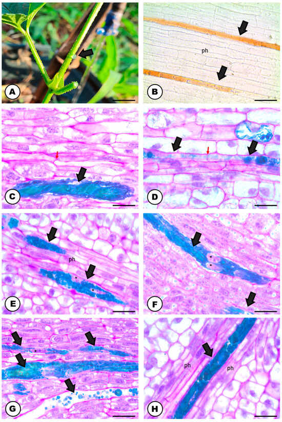Laticifer system and latex of Humulus lupulus. (A) Colorless latex exuding from the internodal region of the stem. (B–H) Longitudinal sections. (B) Laticifer system (arrows) located between phloematic elements of a stainless section of petiole. Note the oxidized orangish color of the latex. (C,D) Precursor cells of the laticifer system in the apical portion of inflorescence buds. Note the terminal cell walls, showing the laticifer articulated structure (red arrows). (E,F) Laticifer system of pistillate flowers showing thicker cell walls (arrows) and nuclei (asterisks) with conspicuous nucleoli. (G,H) Laticifer system of pistillate flowers in detail showing the latex content stained with toluidine blue O (phenolics). Scale bars: (A) = 1 mm; (B) = 50 μm; (C–H) = 20 μm. Abbreviation: ph = phloem.