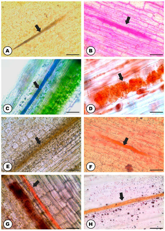 Histochemical analyses of the latex of the stem (A–C,E–H) and the petiole (D) of Humulus lupulus (longitudinal sections). Positive reaction of the latex (arrows) for: (A) Non-structural phenolic compounds (stain: ferric chloride). (B) Polysaccharides (stain: PAS reagent). (C) Terpenes (stain: Nadi reagent). (D) Rubber particles (stain: Oil O Red). (E) Alkaloids (stain: Wagner’s reagent). (F) Proteins (stain: xylidine Ponceau). (G) Tannins (stain: vanillin hydro chloridric acid). (H) Total lipids (stain: Sudan IV). Scale bars: (A–C,F,G) = 50 μm; (D,H) 20 μm; (E) = 100 μm.