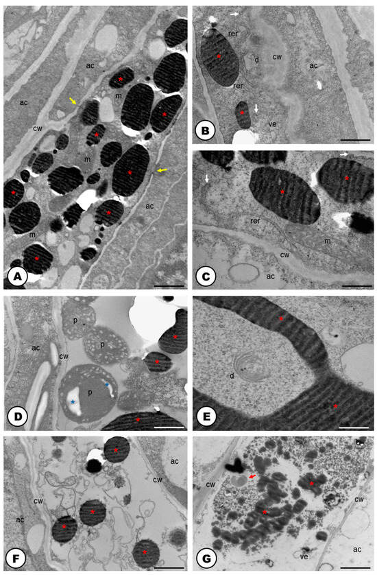 Ultrastructure of the cells forming the developing (A–E) and mature laticifer system (F,G) of Humulus lupulus (TEM). (A) Developing laticifer system with vacuoles filled with phenolics, mitochondria and vacuoles. Note that laticifer is connected with adjacent cells (yellow arrows). (B,C) Up-close view of the cytoplasm showing mitochondrion, rough endoplasmic reticulum, free ribosomes (white arrows), rough endoplasmic reticulum, dictyosomes with dilated vesicles and phenolic droplets (red asterisks). (D) View of the cytoplasm showing phenolic droplets (red asterisks) inside vacuoles and plastids with starch grains (blue asterisks). (E) Up-close view of the cytoplasm showing dictyosomes and phenolic droplets (red asterisks). (F) Up-close view of the cytoplasm showing organelles in an advanced stage of degradation and phenolic droplets (red asterisks). (G) Up-close view of the mature laticifer system cytoplasm full of phenolics (red asterisks), and secretion of unknown nature (red arrows). Scale bars: (A,F,G) = 3 μm; (B,D) = 1 μm, (C,E) = 500 nm. Abbreviations: ac = adjacent cell, cw = cell wall, d = dictyosome, m = mitochondria, p = plastid, rer = rough endoplasmic reticulum, ve = vesicle.