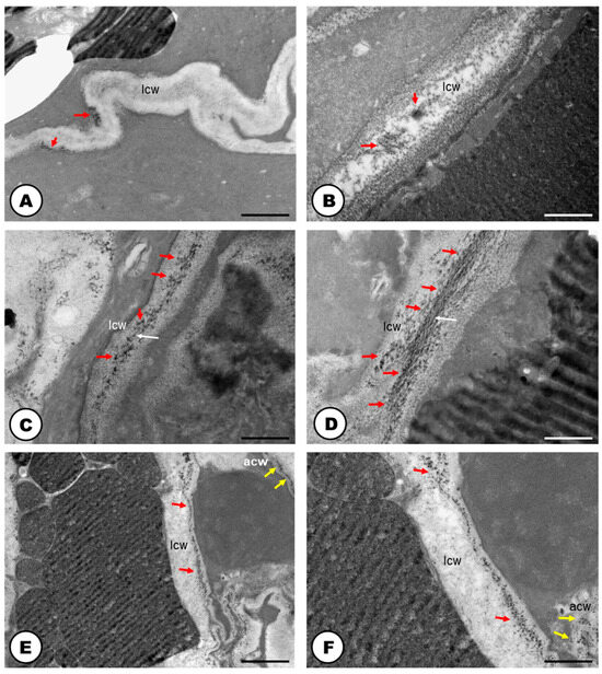 Cytochemistry of vegetative bud developing cells of the articulated laticifer system of Humulus lupulus (TEM). (A) Cellulase control sample, untreated with carboxymethylcellulose. The activity of the enzyme was positive (red arrows). (B) Pectinase control sample, showing positive reaction of the enzyme (red arrows). (C,D) Positive reactions for cellulase treated samples, showing cellulase activity in the cell wall close to the middle lamella (white arrows). (E,F) Positive reactions for pectinase treated samples. Enzyme activity was encountered in the cell wall. Note the electron-dense inclusions (red arrows) which are corresponding to the products of pectinase and cellulase activities in reaction with Benedict’s reagent. In the adjacent cells to the laticifer system, positive reactions for cellulase and pectinase were also observed but less intense (yellow arrows). Scale bars: (A,F) = 1 μm; (B–D) 500 nm; (E) 3 μm. Abbreviations: acw = adjacent cell wall, lcw = laticifer cell wall.