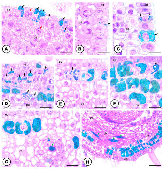 Developmental stages of phenolic idioblasts of Humulus lupulus (LM, stain: toluidine blue O). (A) Longitudinal section of a developing bracteole of a pistillate inflorescence showing precursor cells of phenolic idioblasts. Note the developing cells with mitotic figures (prophase—red arrows). (B-D) Longitudinal sections of developing bracteole (B,C) and bract (D) of a pistillate inflorescence, with developing idioblasts located in the protodermis, directly below it or near the developing parenchyma cells—note the blue droplets of secretion material slowly accumulating inside the vacuoles (black arrows). (E–H) Transversal sections of fully developed bracts of pistillate inflorescences, showing the differences in form and location of idioblasts and laticifer systems (green arrows). Scale bars: (A–G) = 20 μm; (H) = 50 μm. Abbreviations: ep = epidermis, pa = parenchyma, pd = protoderm, vb = vascular bundle.