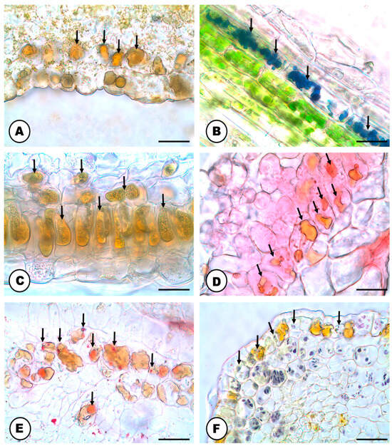 Histochemical analyses of the idioblast content (black arrows) of the idioblast cells in the leaf blade of Humulus lupulus (transversal sections). Positive reaction of the idioblast content for: (A) non-structural phenolic compounds (stain: ferric chloride). (B) Terpenes (stain: NADI reagent). (C) alkaloids (stain: Wagner’s reagent). (D) Proteins (stain: xylidine Ponceau). (E) Total lipids (stain: Sudan IV). (F) Starch (stain: Lugol’s solution) Scale bars: (A–F) = 20 μm.