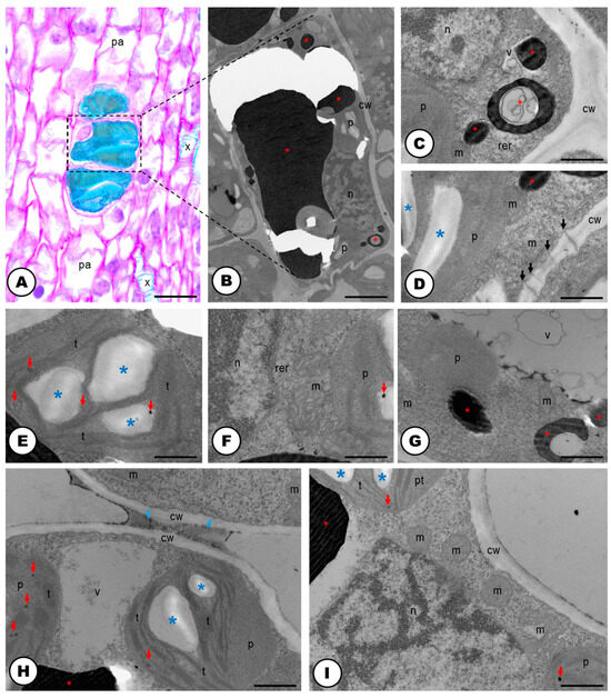 Anatomy (LM) and ultrastructure (TEM) of phenolic idioblasts of Humulus lupulus. (A) Longitudinal section of vegetative bud, with idioblast cells located near the differentiating parenchyma cells (stain: toluidine blue O) and xylematic cells. (B) Panoramic view of an idioblast cell of a vegetative bud with a thin cell wall, one large vacuole filled with phenolics (red asterisk), and an oval nucleus. (C) Up-close view of the cytoplasm, showing a portion of the nucleus, an amyloplast, a mitochondrion, a few small vacuoles and rough endoplasmic reticulum. (D) Up-close view of the cell wall between two idioblasts, highlighting the plasmodesmata (black arrows). (E) Up-close view of one amyloplast with stacked thylakoids, starch grains (blue asterisks) and plastoglobuli (red arrows). (F) Up-close view of the cytoplasm of an idioblast. Note a portion of the nucleus, a plastid with plastoglobuli, a mitochondrion and rough endoplasmic reticulum. (G) Up-close view of the vacuoles filled with phenolics. (H,I) Up-close view of the cytoplasm, plastids with starch grains and plastoglobuli, nucleus, numerous mitochondria and secretion between cell walls of two idioblasts (blue arrows, only in H). Scale bars: (A) = 20 μm; (B) = 2 μm; (C–G) = 500 nm; (H,I) = 1 μm. Abbreviations: cw = cell wall, m = mitochondria, n = nucleus, pa = differentiating parenchyma cell, p = neighboring plastids, rer = rough endoplasmic reticulum, t = thylakoids, v = vacuoles, x = xylem.