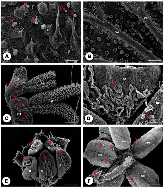 Distribution of glandular trichomes in the plant body of Humulus lupulus (SEM). (A) Capitate (blue arrows) and peltate trichomes (red arrows) on the adaxial side of the leaf. (B) Peltate trichomes on the abaxial side of the leaf. Note that the veins only possess tector (=non-glandular) trichomes in their surface. (C,D) Capitate and peltate trichomes in the pistillate flower. Note the abundance of glandular trichomes in the abaxial side of the sepal, and their absence in the stigma. (E,F) Capitate and peltate trichomes in the dorsal side of the anthers. (E) Adaxial side of the sepal (F) in a staminate flower. Note the abundance of glandular trichomes in the calyx, in the peduncle and only in the connective of the anthers. The glandular trichomes are pointed out by red arrows. Scale bars: (A,D,E,F) = 100 μm; (B,C) = 200 μm. Abbreviations: a = anther, brt = bracteole, pe = peduncle, se = sepal, st = stigma, ve = vein.