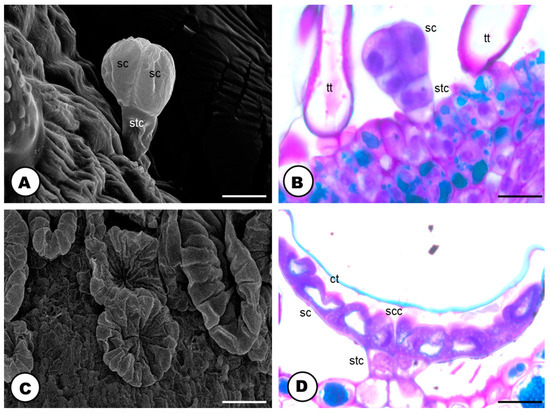 The structure of the capitate and peltate glandular trichomes located on the bracts of a pistillate flower of Humulus lupulus (A,C—SEM; B,D—LM, stained toluidine blue O). (A) Capitate trichome with a stalk and the secretory head cells. (B) Fully developed capitate glandular trichome. Note the elongate stalk cell and the round-shaped secretory head, formed by 3–4 cells with prominent nuclei. (C) Peltate trichomes without an exudate, thus, the flattened shape. (D) Fully developed peltate glandular trichome. Note the cuticle layer, the thinner blue-stained layer, that covers the interior region of the “folding” cells. Scale bars: (A,C) = 10 μm; (B,D) = 20 μm. Abbreviations: ct = cuticle, tt = tector trichomes (=non-glandular), sc = secretory cells, scc = subcuticular cavity, stc = stalk cells.