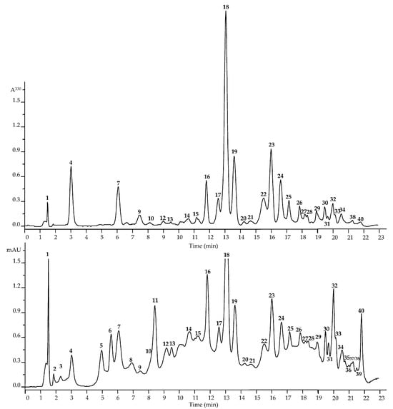 The analysis of metabolites in D. oxyodonta extracts was conducted using the HPLC–PDA–ESI–tQ–MS methodology. This comprehensive analysis allowed us to identify 40 distinct compounds (Figure 2 and Figure S1; Table 1). The identification process adhered to the recommended minimum reporting standards for chemical analysis, as outlined by the Chemical Analysis Working Group. Specifically, compounds were identified using retention times, UV and MS spectra, and by comparison with standard compounds and the existing literature [20]. Metabolite identification was performed at two levels, with nineteen compounds fully characterized at the first level and twenty-one provisionally annotated at the second level.