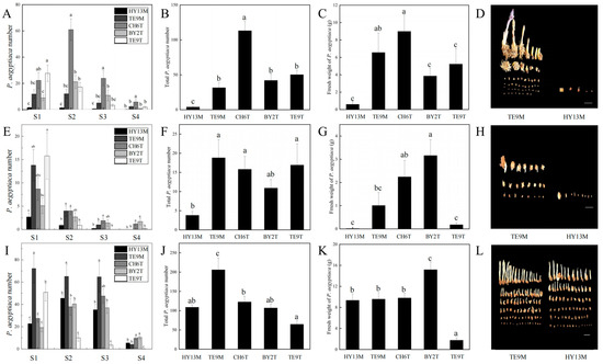 The parasite number of different P. aegyptiaca populations parasitizing C. lanatus, L. siceraria, and C. moschata. (A) The number of P. aegyptiaca parasitizing C. lanatus at different parasitic stages. (B) The total number of P. aegyptiaca parasitizing C. lanatus. (C) Fresh weight of P. aegyptiaca parasitizing C. lanatus. (D) Presentation of TE9M and HY13M parasitizing C. lanatus. (E) The number of P. aegyptiaca parasitizing L. siceraria at different parasitic stages. (F) The total number of P. aegyptiaca parasitizing L. siceraria. (G) Fresh weight of P. aegyptiaca parasitizing L. siceraria. (H) Presentation of TE9M and HY13M parasitizing L. siceraria. (I) The number of P. aegyptiaca parasitizing C. moschata at different parasitic stages. (J) The total number of P. aegyptiaca parasitizing C. moschata. (K) Fresh weight of P. aegyptiaca parasitizing C. moschata. (L) Presentation of TE9M and HY13M parasitizing C. moschata. Data are presented as mean ± SE. The letters above each bar indicate significant (p ≤ 0.05) differences between groups based on Duncan’s test. Scale bars = 2 cm.