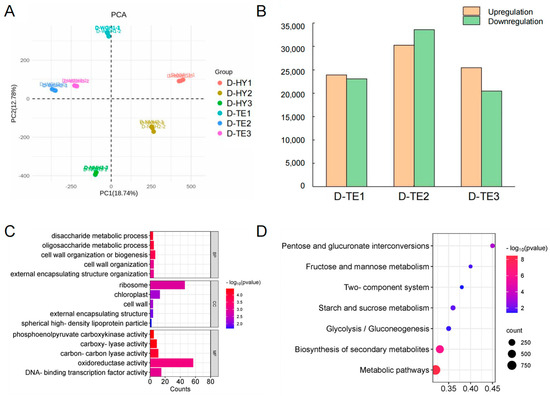 To analyze the parasitism mechanism of P. aegyptiaca, RNA sequencing (RNA-Seq) was performed to evaluate different populations of P. aegyptiaca (HY13M and TE9M) parasitizing C. lanatus at different parasitic stages. The PCA analysis results showed that the three replicates of each P. aegyptiaca population clustered together (Figure 2A). The expression trend of selected genes was consistent with their expression trend in the transcriptome analysis by means of qRT-PCR, showing the reliability of the RNA-Seq expression data (Supplementary Figure S1). In the three parasitic stages, 23,902, 30,288, and 25,459 genes were significantly upregulated in D−TE1, D−TE2, and D−TE3, respectively, and 23,090, 33,611, and 20,474 genes were significantly downregulated in D−TE1, D−TE2, and D−TE3, respectively (Figure 2B). Among the DEGs of the “D−TE3 vs. D−TE2” comparison group, the most significantly enriched terms were “disaccharide metabolic”, “oligosaccharide metabolic”, “cell wall organization or biogenesis”, “external encapsulating structure organization”, and “cell wall organization” in the BP category; “phosphoenolpyruvate carboxykinase activity”, “carboxy-lyase activity”, and “carbon–carbon lyase activity” in the MF category; and “ribosome”, “chloroplast”, “cell wall”, and “external encapsulating structure” in the CC category (Figure 2C).