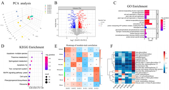 Overview of differential proteomics based on DIA-based liquid chromatography–mass spectrometry analysis. (A) Principal component analysis based on protein expression. (B) Volcano plots of DEP abundance in “D−HY1 vs. D−TE1” comparison; t-test-based significance values (log10 (p-value)) are plotted versus log2 (protein quantity ratio for all proteins between D−HY1 and D−TE1). Upregulated proteins with p < 0.05 and log2 fold-change > 1.5 are plotted in red; downregulated proteins with p < 0.05 and log2 fold-change < −1.5 are plotted in blue. (C) GO enrichment analysis of DEPs in “D−HY1 vs. D−TE1” comparison (p < 0.05). (D) Top 9 terms of KEGG enrichment analysis of DEPs in “D−HY1 vs. D−TE1” comparison. (E) Correlation matrix of module eigengene values obtained for stage-specific parasitic traits of two P. aegyptiaca populations (HY13M andTE9M) parasitizing C. lanatus. The WGCNA grouped proteins into modules based on the patterns of their co-expression. Each of the modules was labeled with a unique color as an identifier. Eight modules were identified; each module eigengene was tested for correlation with stage-specific parasitic traits. (F) Clustering heatmap and annotation of cell wall metabolism proteins in turquoise module; deep blue to red indicates the gene expression level from low to high. Expression levels are normalized.
